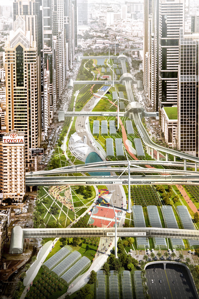 Designed by Toronto and Dubai based architects, Machou Architects Group, the proposed “Super Park” will sink a portion of the busy Sheikh Zayed Road below ground, making space for 25 kilometres of greenery above.
